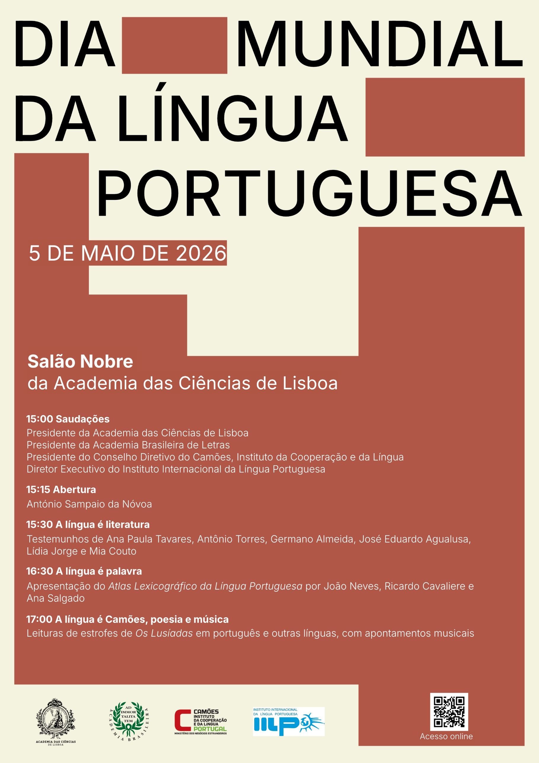 O Presidente da Academia das Ciências de Lisboa, o Presidente da Academia Brasileira de Letras, a Presidente do Camões, Instituto da Cooperação e da Língua e o Diretor Executivo do Instituto Internacional da Língua Portuguesa, convidam para a celebração do Dia Mundial da Língua Portuguesa, que decorrerá no Salão Nobre da Academia das Ciências de Lisboa no dia 5 de maio de 2026, a partir das 15H, conforme programa.